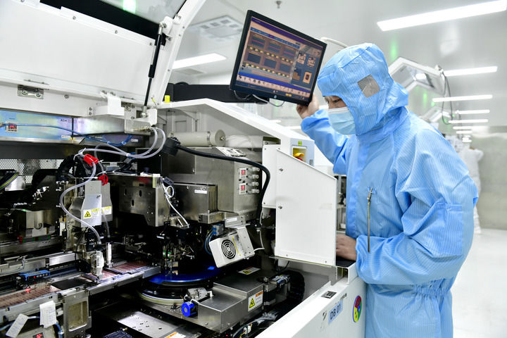 在江苏昆山丘钛微电子科技股份有限公司,无尘车间里一条条机械手臂稳步移动,将指甲盖大小的摄像头拿起、检测、再放回托盘。