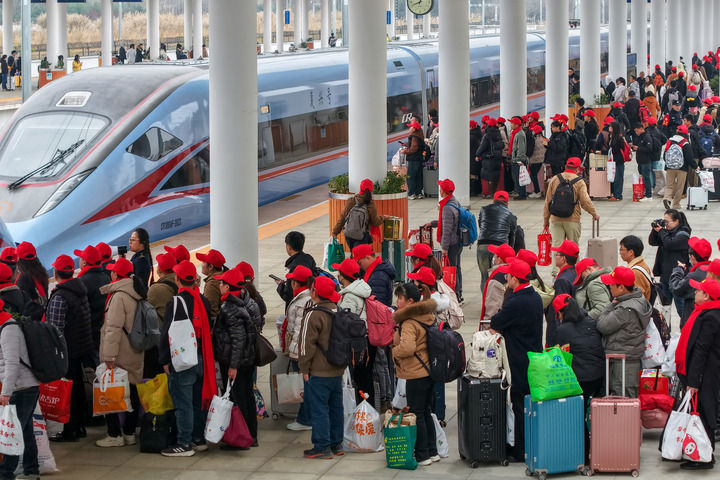2025年2月5日,务工专列乘客在云南省广南县站登车(无人机照片)。