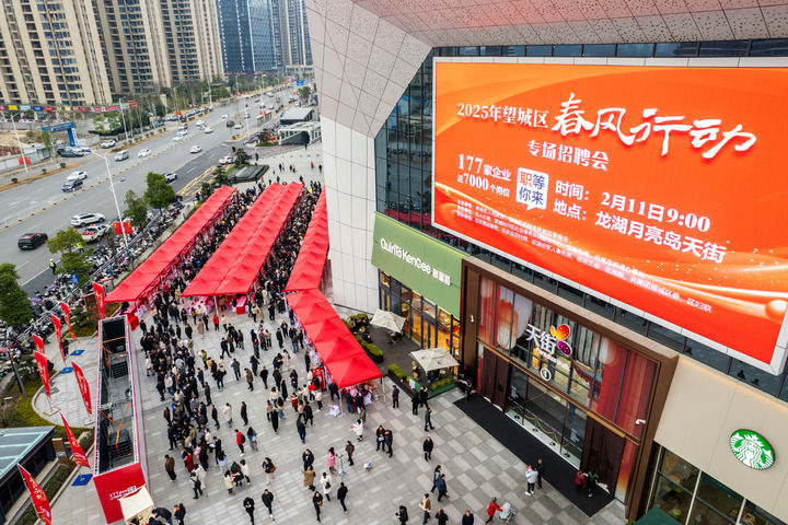 这是2025年2月11日在湖南省长沙市望城区龙湖月亮岛天街商场外坪拍摄的招聘会现场(无人机照片)。