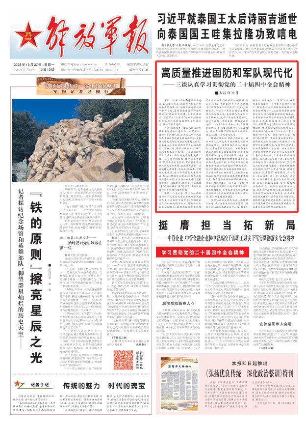 党的二十届四中全会着眼强国建设、民族复兴伟业,站在时代发展和战略全局的高度,对“如期实现建军一百年奋斗目标,高质量推进国防和军队现代化”作出重大部署、提出明确要求,为我军在“十五五”时期开创国防和军队现代化新局面指明了前进方向、提供了根本遵循。