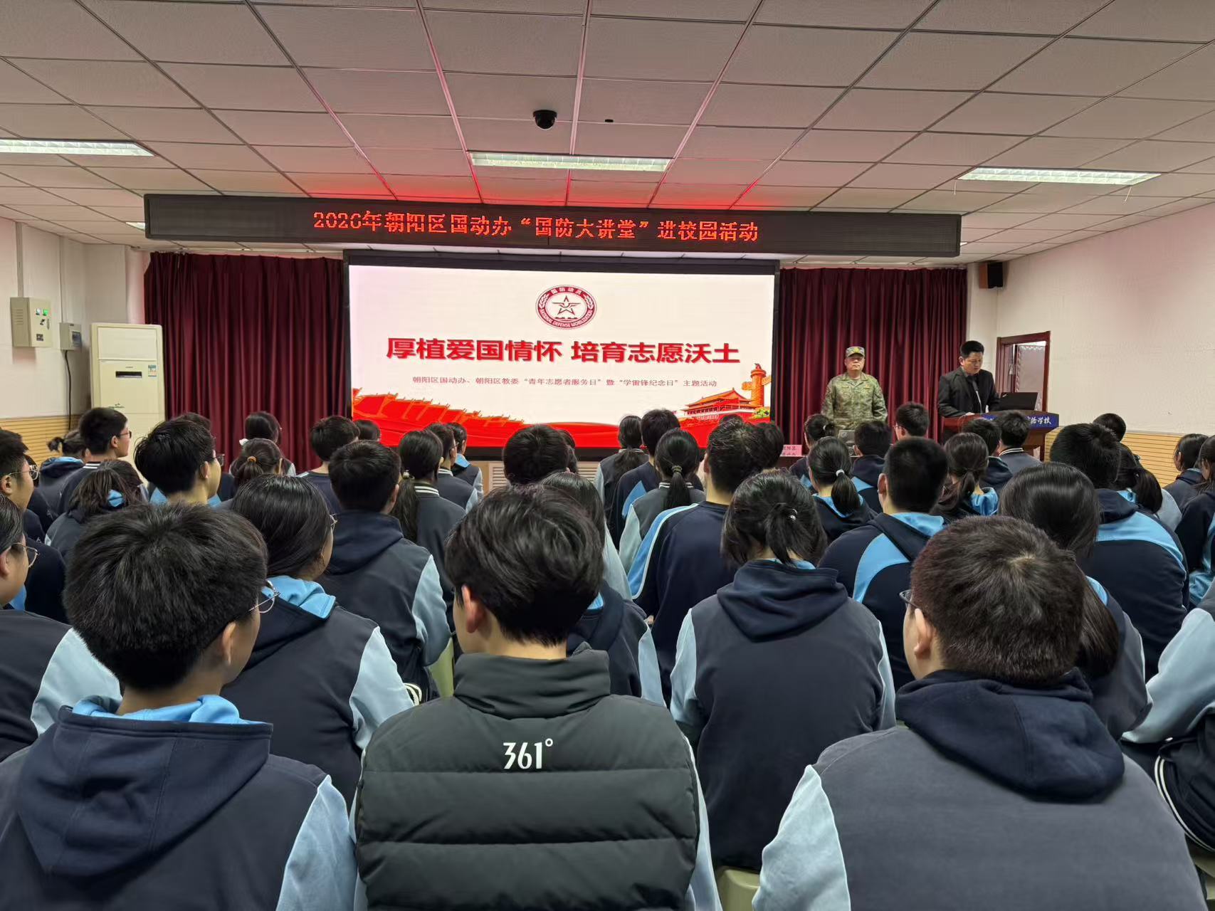 3月5日是学雷锋纪念日,也是中国青年志愿者服务日。当天,朝阳区国动办联合朝阳区教委在北京工业大学实验学校组织“国防大讲堂”活动,通过国防志愿者宣讲,将国防教育与雷锋精神深度融合,引导、鼓励青少年成为国防志愿者。