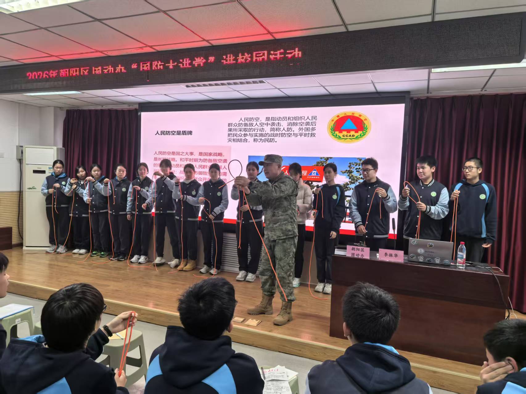 活动现场,朝阳区国动办通过知识宣讲、案例解读、互动体验等多种形式,向现场170余名中学生普及国防知识、人防技能。