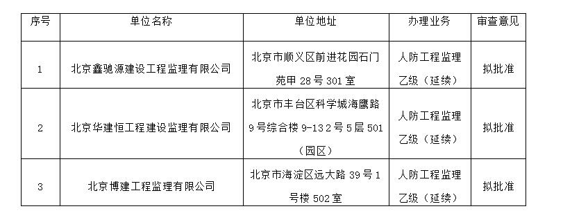 北京市人民防空办公室关于北京鑫驰源建设工程监理有限公司等3家企业监理资质审查结果的公示